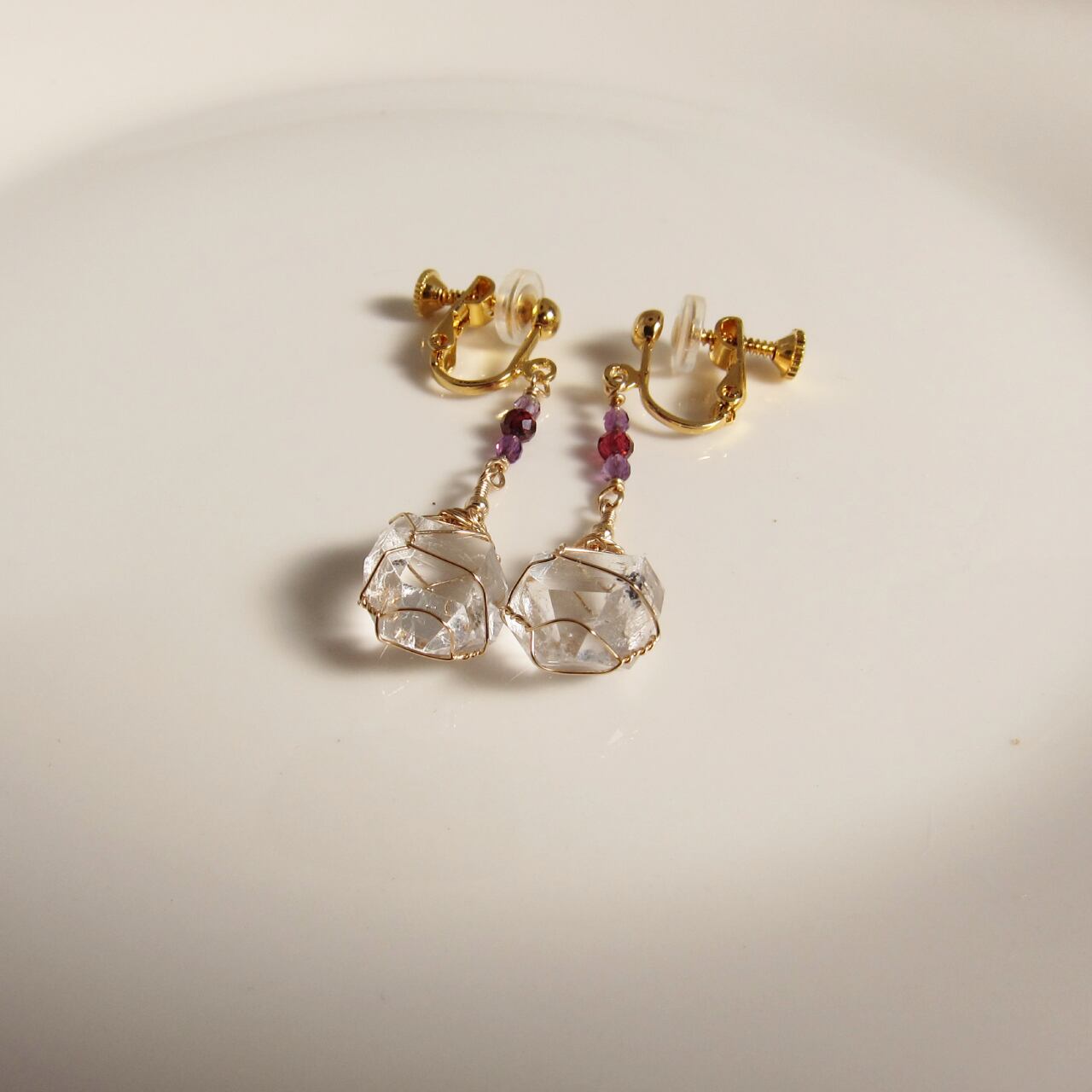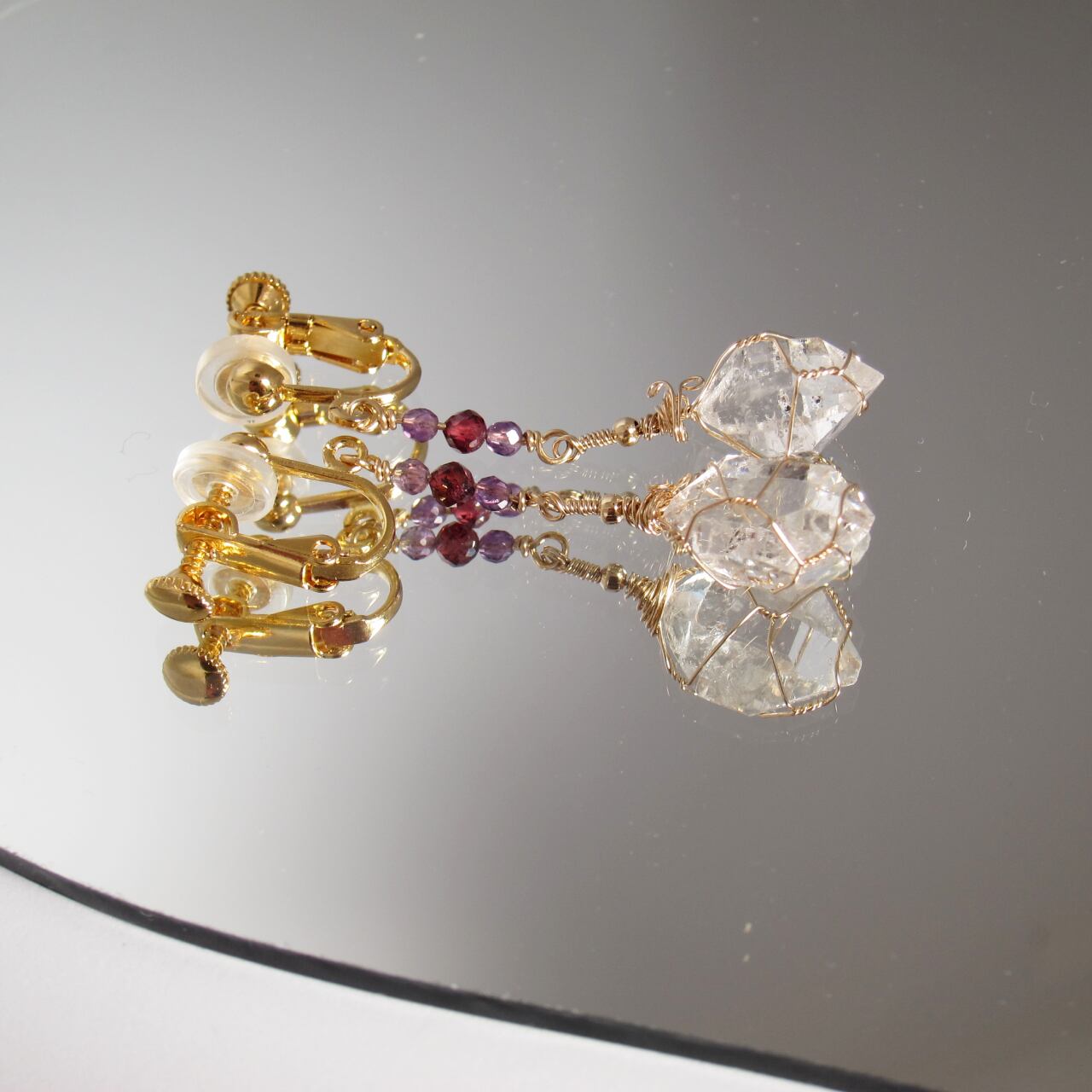 素材:ハーキマーダイヤモンド(7ct)× 2個、14KGFワイヤー、ガーネットビーズ、アメジストビーズ、イヤリングパーツ(サージカルステンレス、24金メッキ)