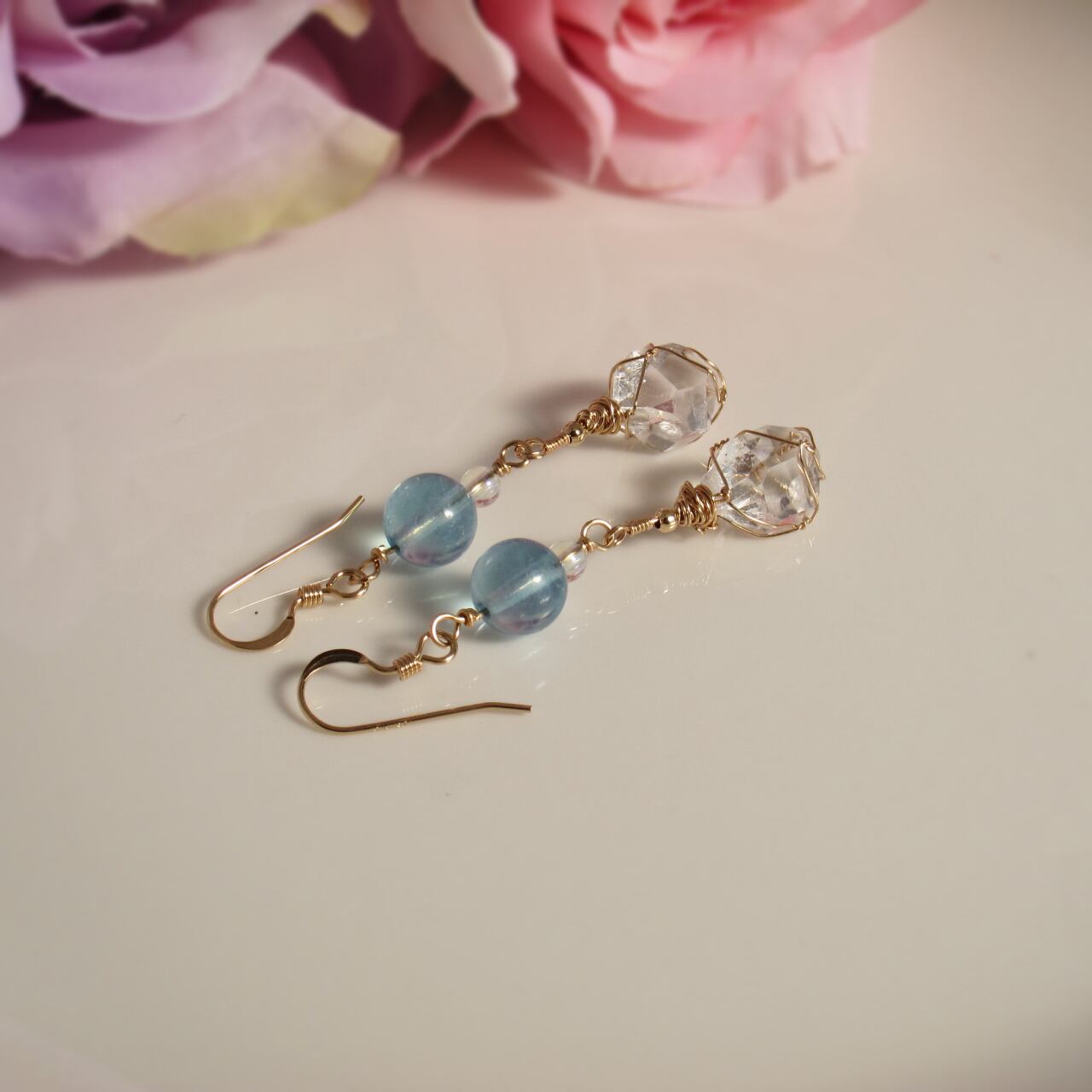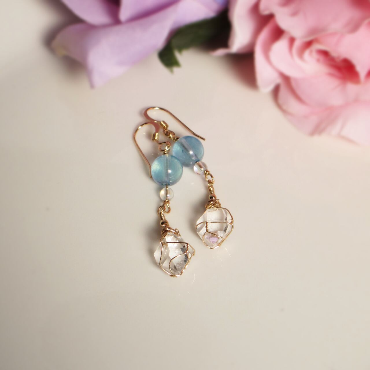素材:ハーキマーダイヤモンド(4ct)× 2個、14KGFワイヤー、アクアマリンビーズ、オーロラクォーツビーズ